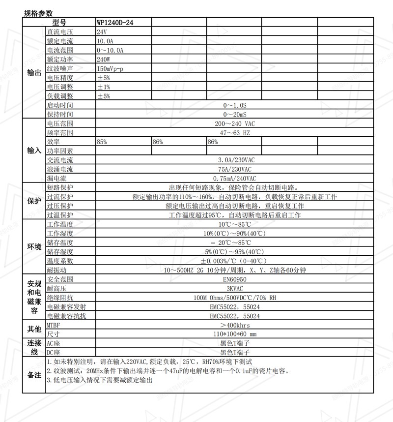 名稱:24V10A導軌電源_240W導軌電源型號:WP1240D-24規格參數: